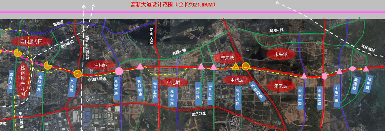 本項目道路橫穿東湖示范區(qū)光谷光電子產(chǎn)業(yè)園、光谷生物城、光谷中心城、光谷未來城等主要產(chǎn)業(yè)聚集區(qū)。道路全長約21公里,紅線寬度為65-120m。本次全面提檔升級改造,將優(yōu)化交通組織,提升沿線景觀,融入智慧元素,體現(xiàn)科技化的設(shè)施系統(tǒng),旨在將其打造成高新區(qū)、武漢市對外的景觀窗口,具有創(chuàng)新發(fā)展特色的城市名片,成為享譽國內(nèi)外的景觀大道。